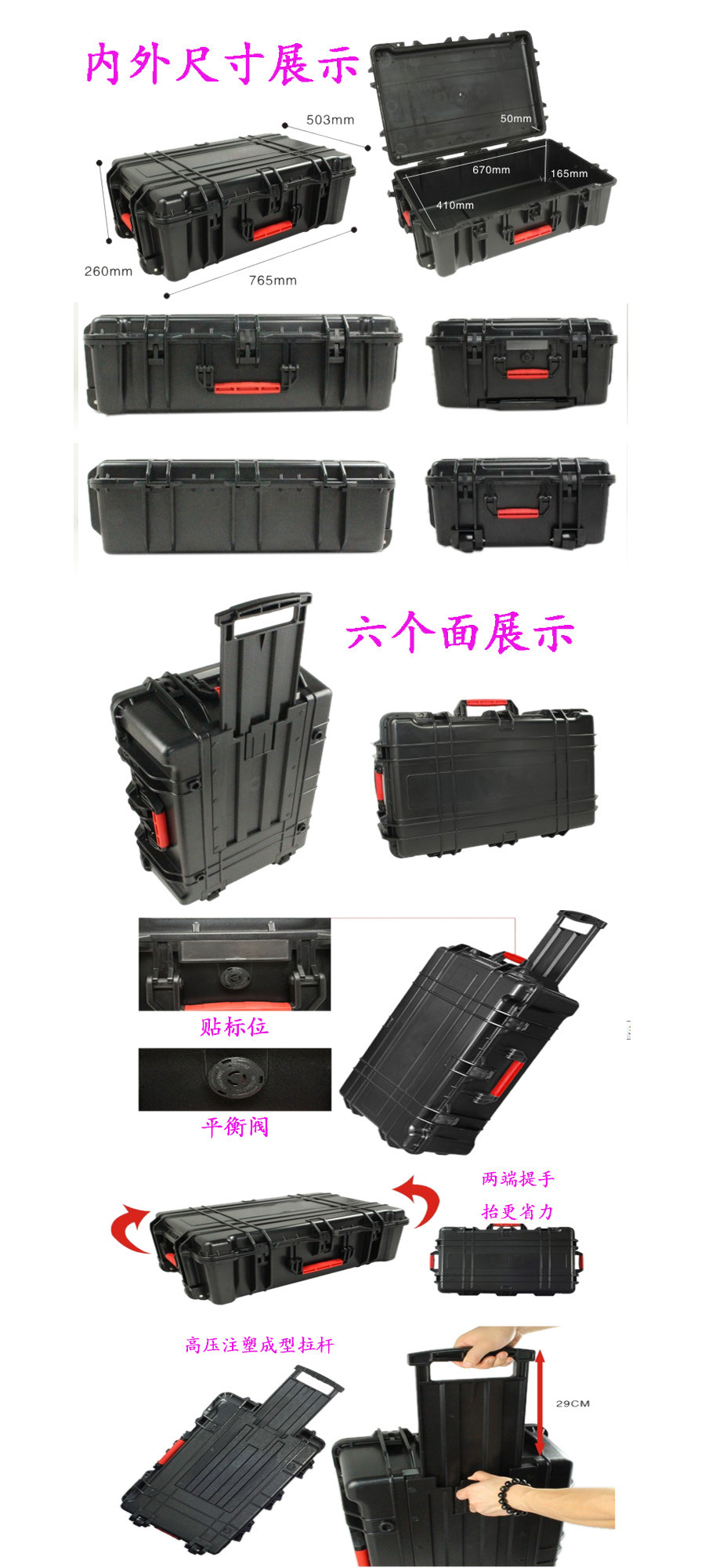 簡(jiǎn)要說(shuō)明:廣泛用于傳媒、公安、消防、軍隊(duì)、航空、戶外攝影、野外考察、科學(xué)探測(cè)等眾多領(lǐng)域的高端儀器、儀表。具有高強(qiáng)度、高抗壓沖擊、防潮、絕對(duì)密封、防塵、防水等特點(diǎn)。產(chǎn)品材質(zhì):ABS原料,箱體采用高抗沖擊的高分子聚合材料一體注塑成型,密封采用扁型彈性發(fā)泡密封橡膠條,確保防水氣密,所有較軸均采用不銹鋼材質(zhì)。