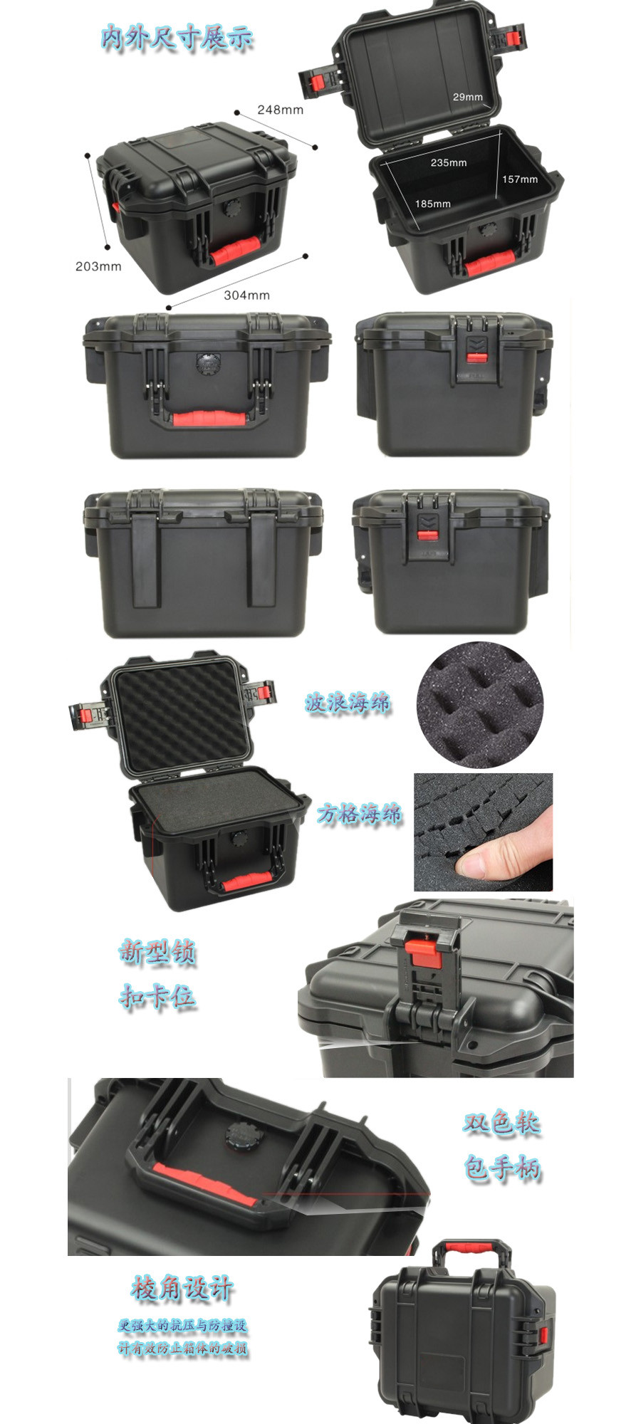 簡要說明:廣泛用于傳媒、公安、消防、軍隊(duì)、航空、戶外攝影、野外考察、科學(xué)探測等眾多領(lǐng)域的高端儀器、儀表。具有高強(qiáng)度、高抗壓沖擊、防潮、絕對密封、防塵、防水等特點(diǎn)。產(chǎn)品材質(zhì):ABS原料,箱體采用高抗沖擊的高分子聚合材料一體注塑成型,密封采用扁型彈性發(fā)泡密封橡膠條,確保防水氣密,所有較軸均采用不銹鋼材質(zhì)。